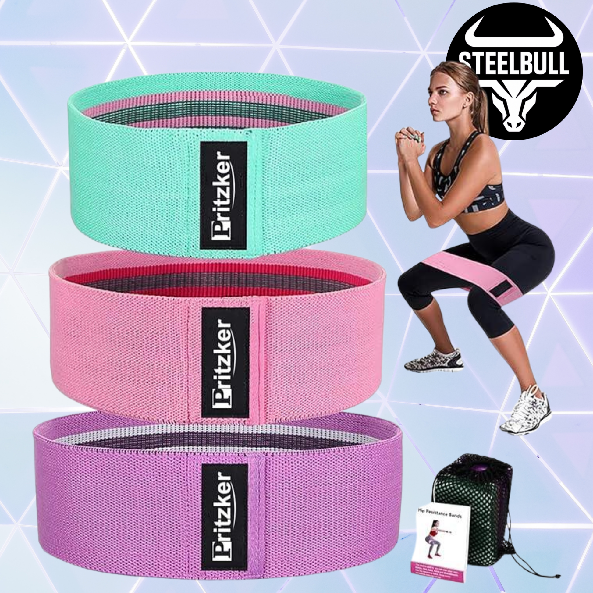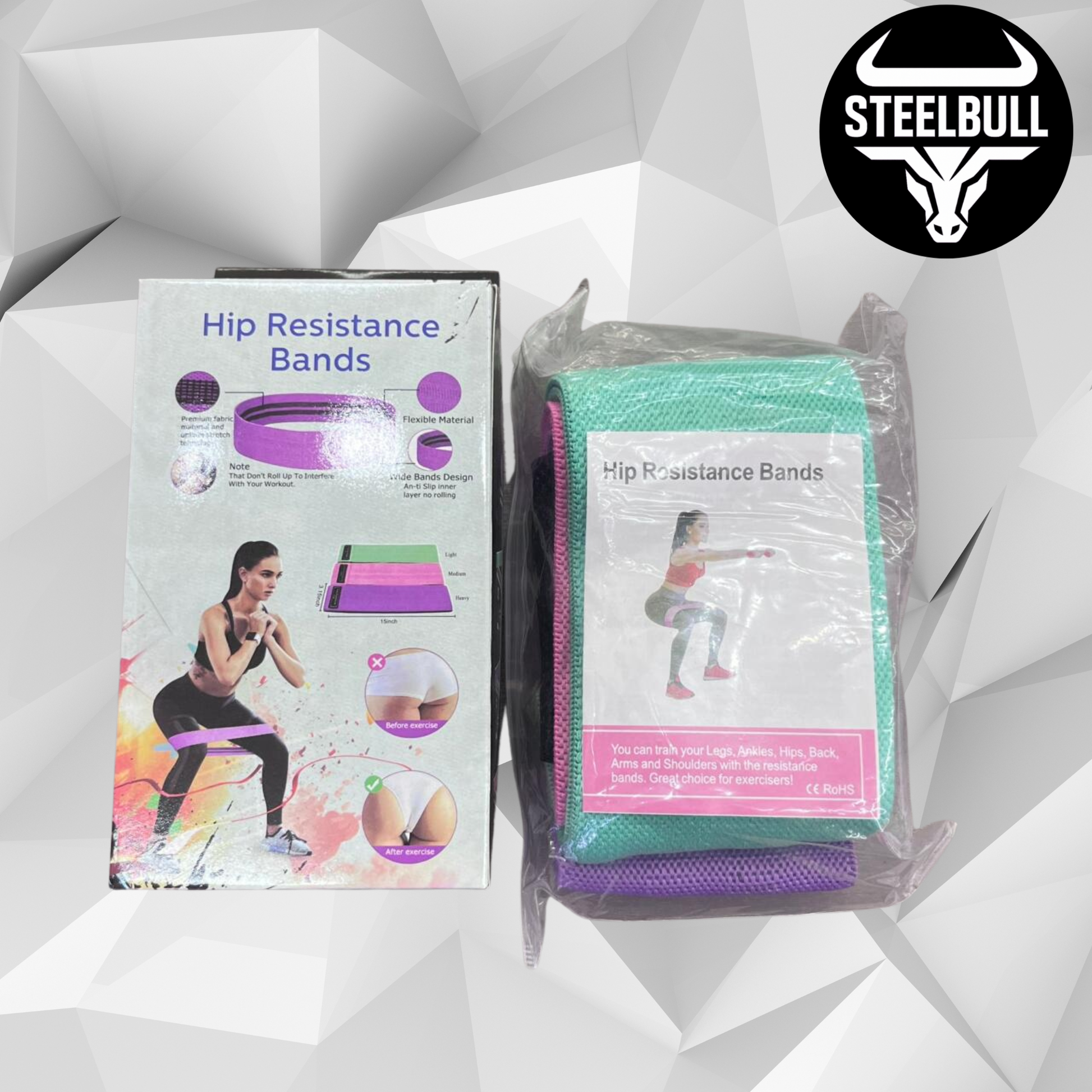 ¡Tu entrenamiento de glúteos y piernas, donde quieras! Tu Set de Bandas de Tela STEELBULL Incluye: